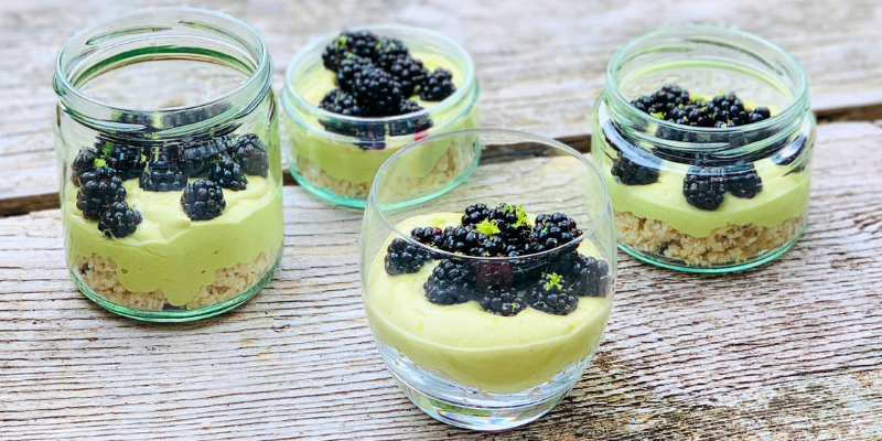 Summer Lime Mousse with fresh blackberries and macadamia coconut crumble