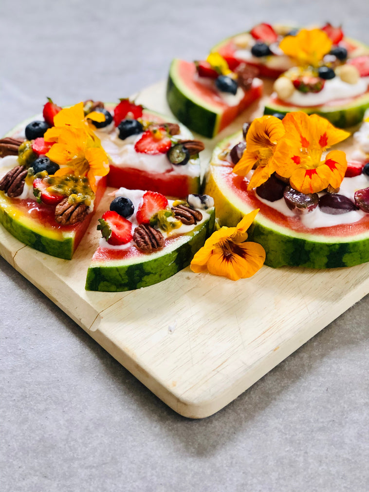 Spread the yoghurt over the red part of the watermelon flesh. It is really important that the yoghurt is thick. If not, it will run very quickly once sitting on the watermelon for a while. If your yoghurt is not thick, you can pour it into a muslin cloth and allow to drain for a little while, this will remove the whey/water and thicken the yoghurt into a ‘labne’ which is thicker. Alternatively, you could use ricotta or cream cheese or diary-free alternative.